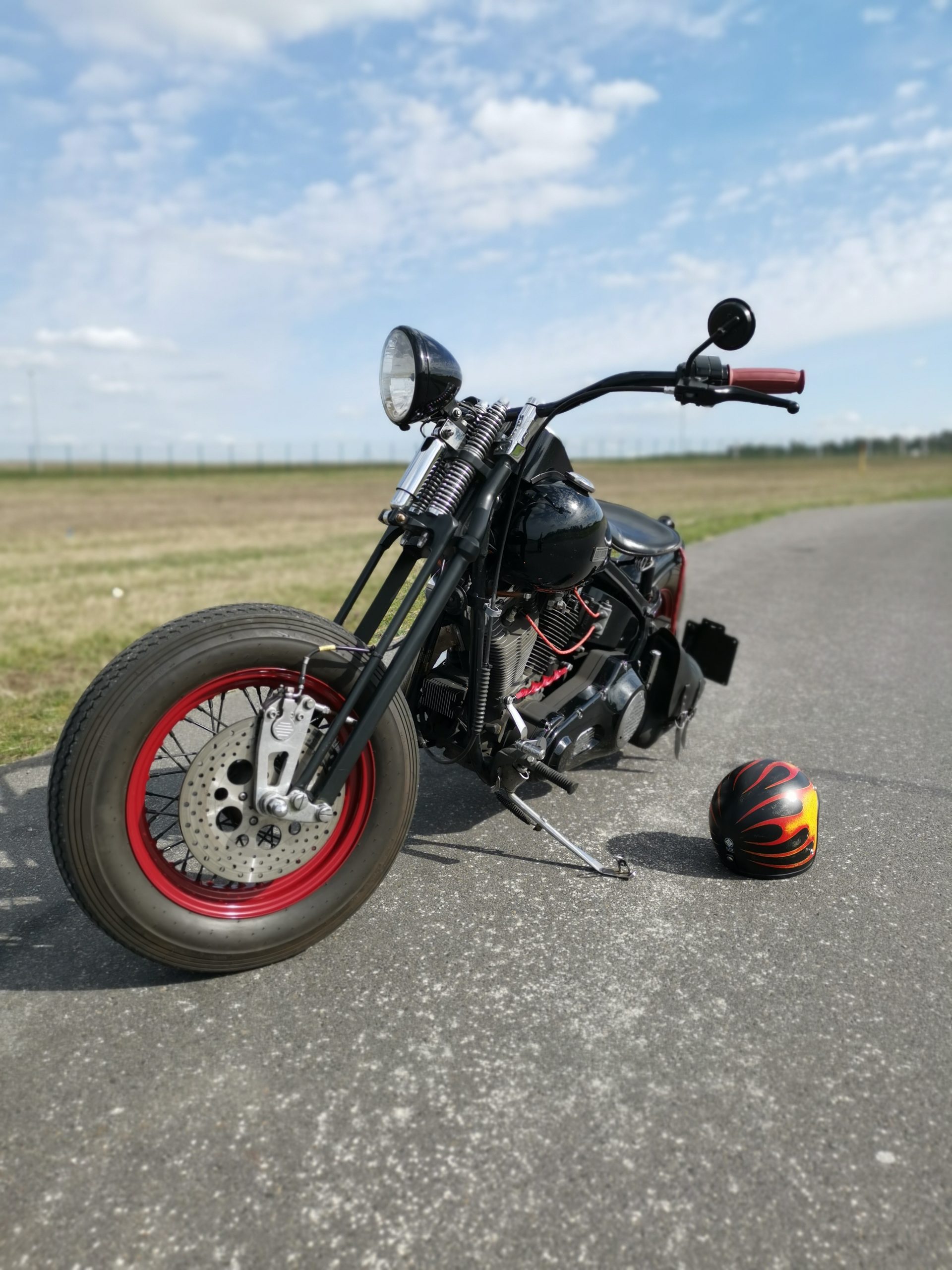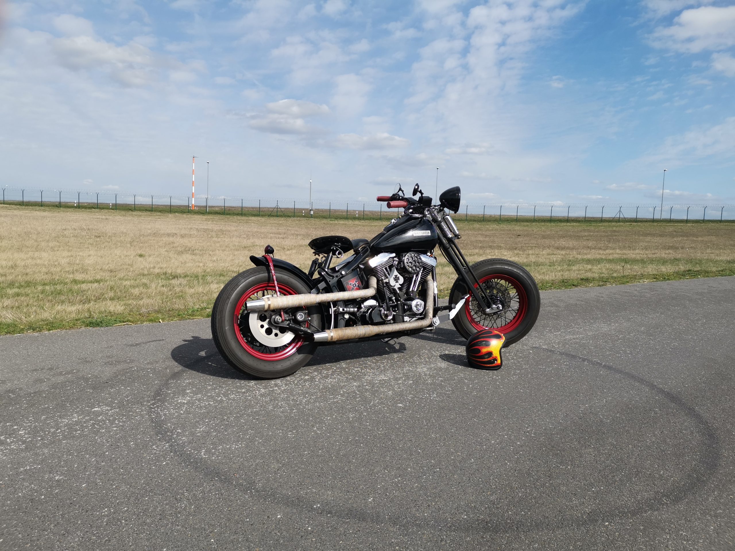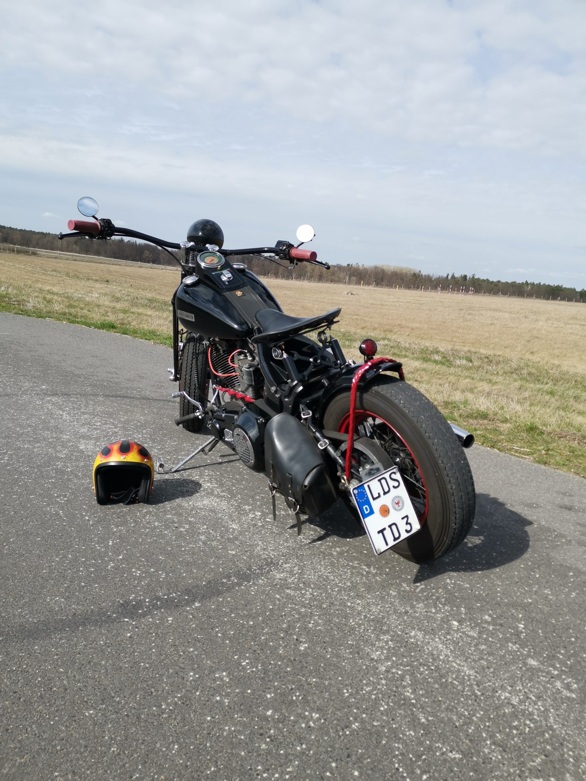 Besonderheiten: Eigenbauheck aus Stahl, Eigenbausattelstütze, Eigenbaukickerpedal Alu,Eigenbau Schaltgestänge, Eigenbau Tankembleme, Minitrittbretter, 2 Kolben Stroker Bremssattel vorne, LED-Microblinker, seitlicher Kennzeichenhalter, LasVegas Spielwürfel als Ventilkappen, Ölstopfen HD-California, LED-Oldschool Rücklicht,Vintage Zündkabel,WLA-Style Tacho