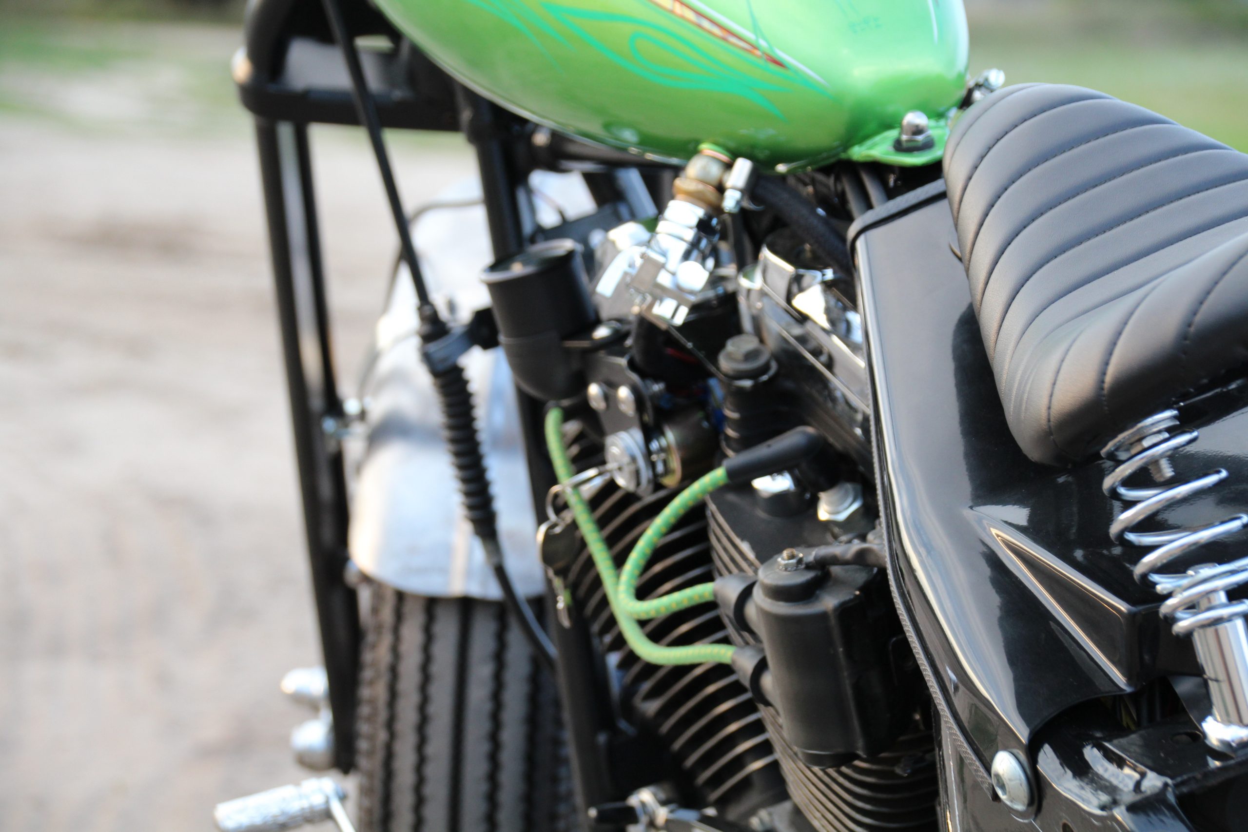 Besonderheiten: Eigenbauheck aus Stahl, Eigenbau Frontfender aus Stahl, Eigenbau Scheinwerferhalter, Motogadget M-Unit Steuergerät, Motogadget M-Button, Motogadget Microblinker, Minitacho MMB Generation II Target, Schaltgestänge Alu CNC, Eigenbau Tankhalterung, LasVegas Spielwürfel als Ventilkappen, LED-Oldschool Rücklicht, Vintage Zündkabel, 2 Kolben Stroker Bremssattel vorne, Eigenbau Kickerpedal, seitlicher Kennzeichenhalter
